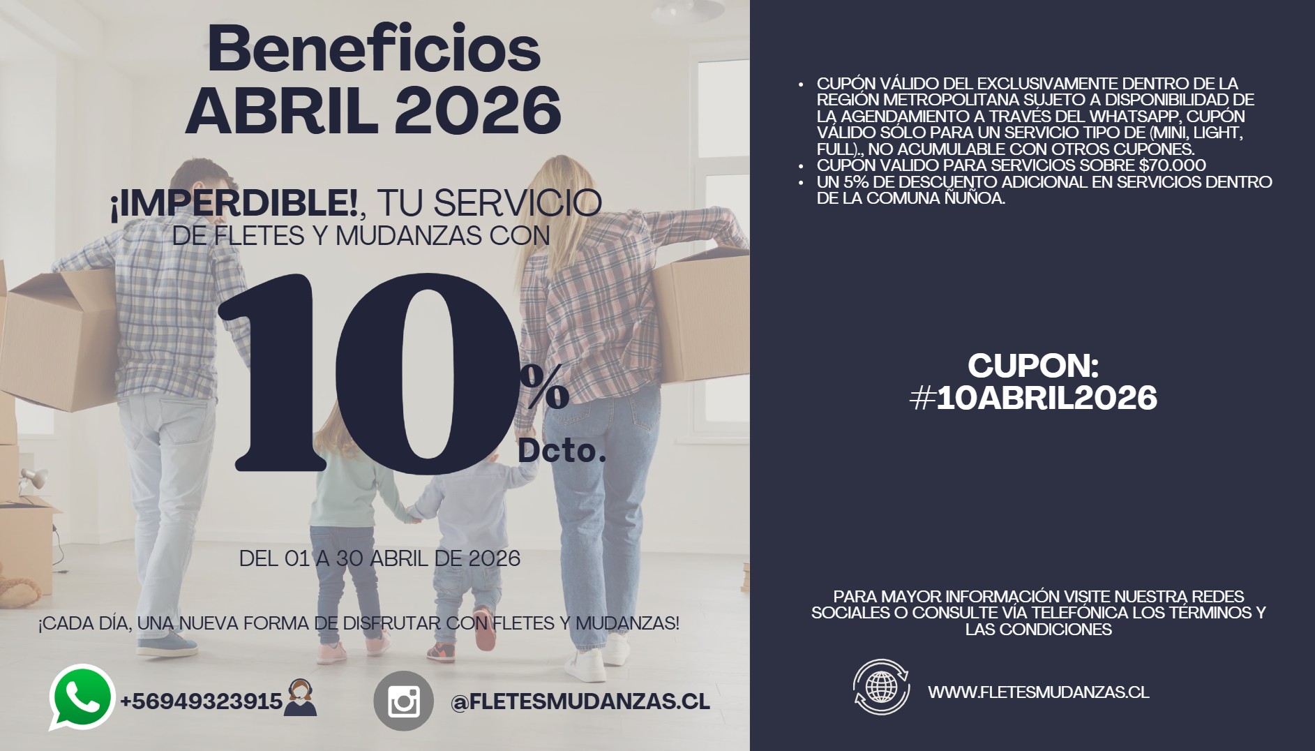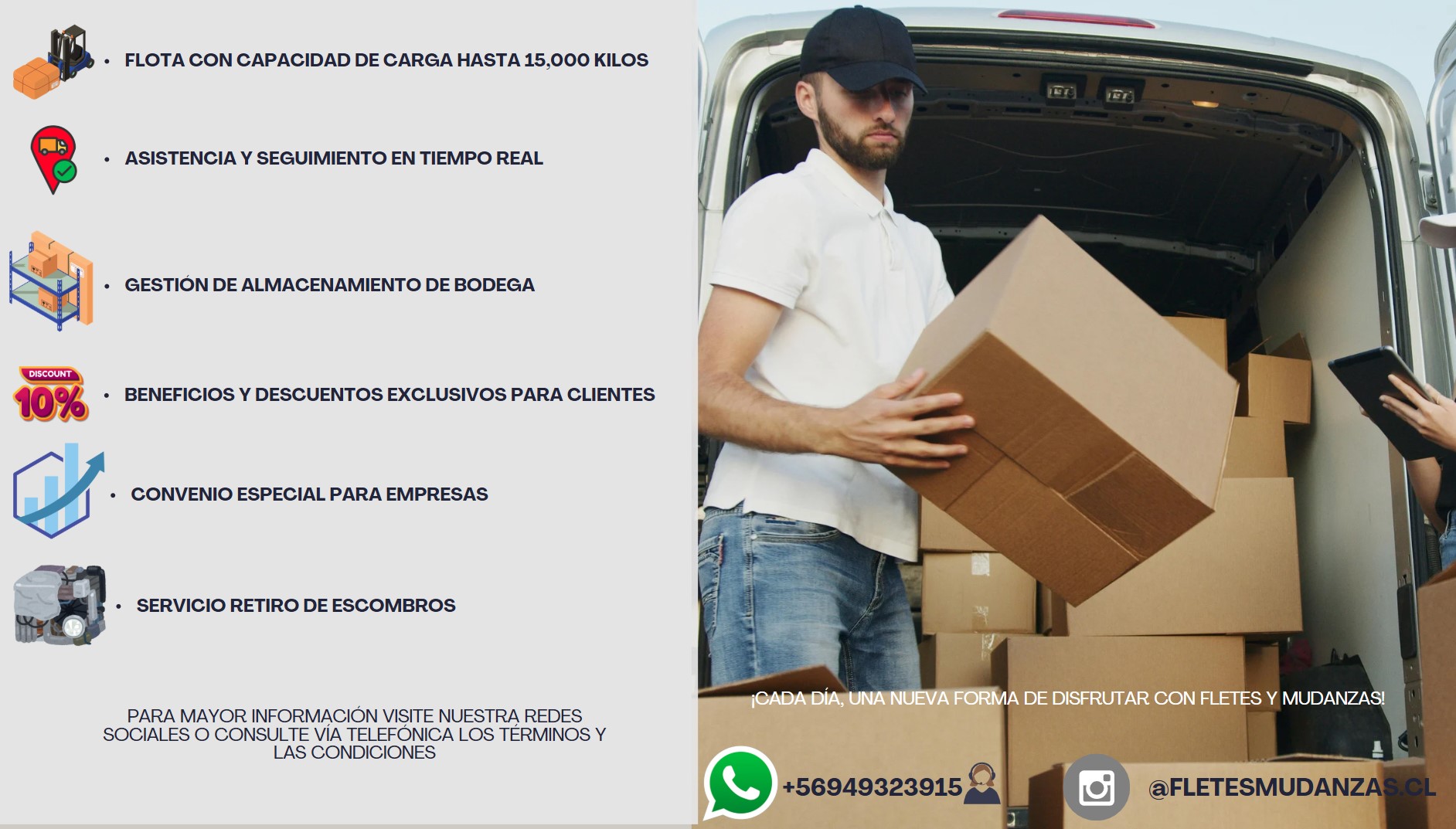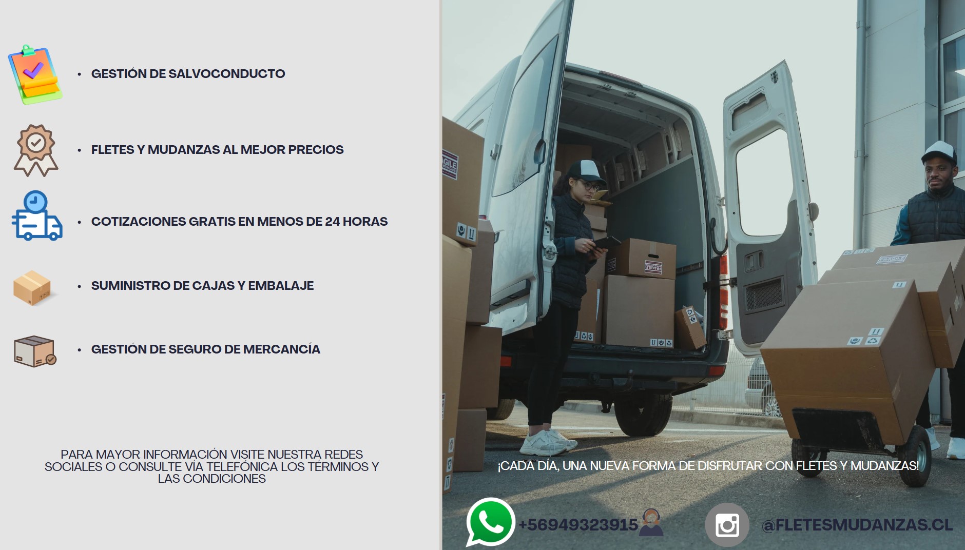 FletesMudanzas.cl nace como un emprendimiento familiar con el propósito de brindar un servicio de traslado seguro, confiable y cercano para todas las personas que comienzan una nueva etapa. Con el compromiso de hacer cada mudanza más simple y humana, nos especializamos en servicios de Transportes, fletes, mudanzas particulares y de empresas, dentro de la Región Metropolitana y hacia distintas regiones del país.